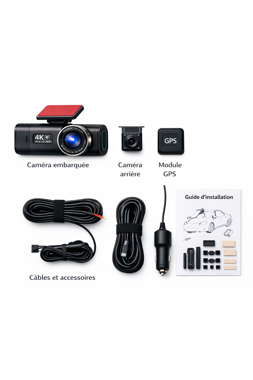 Votre dashcam est livrée avec tous les éléments nécessaires pour une installation simple et rapide. Branchez, installez, roulez l’esprit tranquille.